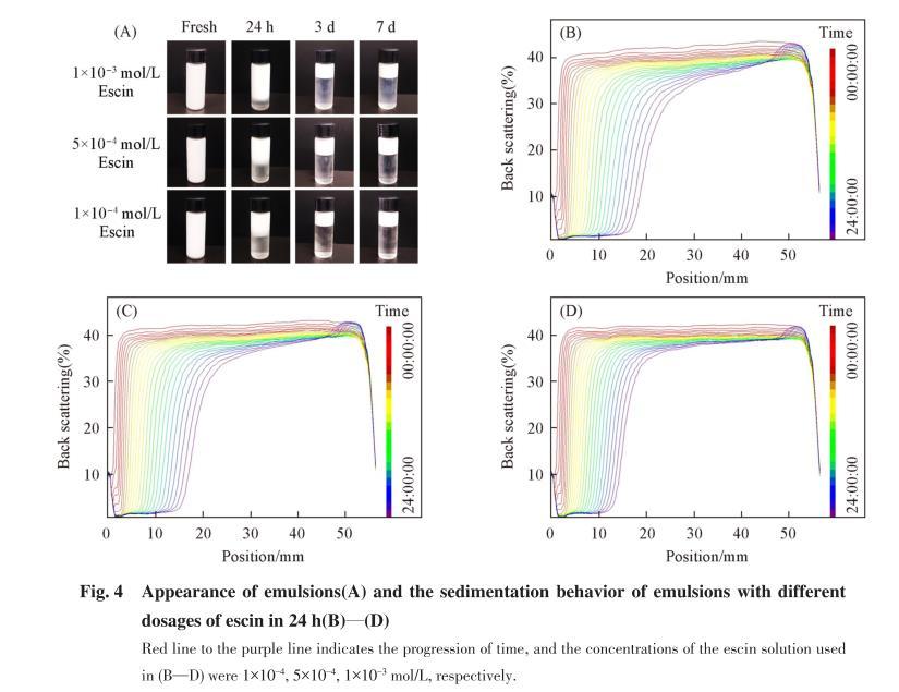 可見,七葉皂素濃度為1×10-4和5×10-4mol/L時,在24 h內分層較明顯,前者的分層程度略大于后者,當濃度為1×10-3mol/L時,分層得到明顯抑制,較為穩定,該現象與貯存穩定性表征結果一致[圖4(A)].這是由于兩親性的七葉皂素分子結構具有較多的含氧基團(羥基和羧基),在油-水界面層具有強分子間作用(氫鍵),高濃度形成的界面膜的收縮彈性強于低濃度,在油-水界面發生形變時,界面膜產生相應形變而非解吸附,因此高濃度七葉皂素所形成的乳液穩定性相對更好.