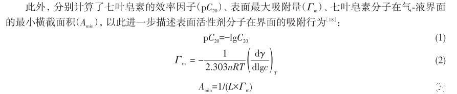 此外,分別計算了七葉皂素的效率因子(pC20)、表面最大吸附量(Γm)、七葉皂素分子在氣-液界面的最小橫截面積(Amin),以此進一步描述表面活性劑分子在界面的吸附行為: