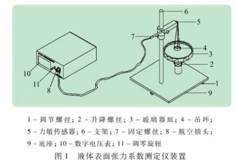 1-調(diào)節(jié)螺絲;2-升降螺絲;3-玻璃器皿;4-吊環(huán);5-力敏傳感器;6-支架;7-固定螺絲;8-航空插頭;9-底座;10-數(shù)字電壓表;11-調(diào)零旋鈕