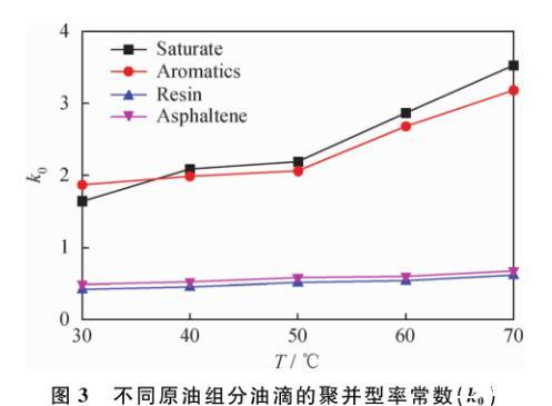 圖3為不同原油組分油滴的聚并速率常數(shù)。由圖3可知,不同溫度下膠質(zhì)和瀝青質(zhì)油滴的聚并速率常數(shù)遠小于飽和分和芳香分,即在含聚水相中由膠質(zhì)和瀝青質(zhì)形成的油-水界面穩(wěn)定性更高,破裂更難。換言之,可使油滴在含聚水相中穩(wěn)定存在的原油組分為膠質(zhì)和瀝青質(zhì),其中膠質(zhì)的穩(wěn)定性作用大于瀝青質(zhì)。瀝青質(zhì)、膠質(zhì)是鍵接各種極性基團(主要有含氧、含硫和含氮基團,如羰基、羧基、羥基、酚羥基、硫醚、吡咯和吡啶等)的大分子有機化合物,在油-水界面具有較強的界面活性,故可穩(wěn)定油滴。一般而言,膠質(zhì)的相對分子質(zhì)量及極性基團含量均小于瀝青質(zhì)。膠質(zhì)的穩(wěn)定性作用大于瀝青質(zhì),可能是由于其相對分子質(zhì)量小,分子間作用力小于瀝青質(zhì)分子間作用力,所以有可能膠質(zhì)更易與含聚水相中的聚合物發(fā)生作用,從而增強油滴穩(wěn)定性。