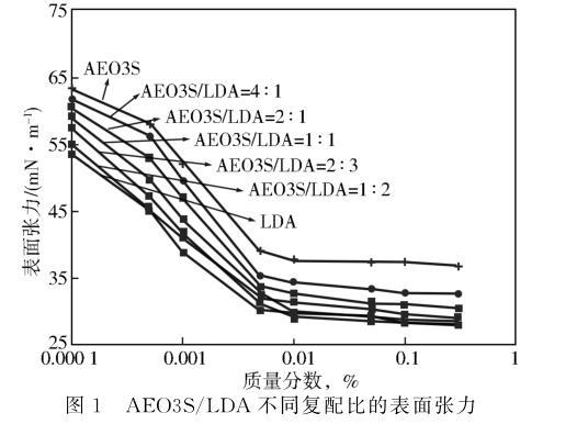 圖1 AEO3S/LDA不同復配比的表面張力