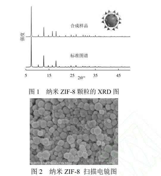 納米ZIF-8顆粒的XRD譜圖如圖1所示。合成的樣品譜圖分布與標(biāo)準(zhǔn)譜圖匹配,且所獲得的衍射峰與文獻(xiàn)吻合,未出現(xiàn)雜峰,表明制備的樣品具有單一相且結(jié)晶度良好。由謝樂(lè)公式計(jì)算得到晶粒尺寸約為70 nm。由納米ZIF-8顆粒的掃描電鏡照片可見,ZIF-8顆粒形貌為六邊形,平均尺寸為65.8 nm,與XRD計(jì)算結(jié)果一致。