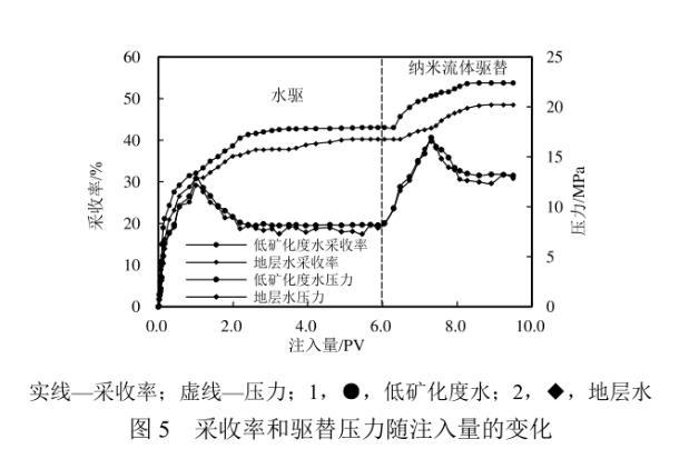 在驅(qū)油機(jī)理實(shí)驗(yàn)探究的基礎(chǔ)上,優(yōu)選納米ZIF-8顆粒質(zhì)量分?jǐn)?shù)為0.03%的納米流體進(jìn)行巖心驅(qū)替實(shí)驗(yàn)。采收率及驅(qū)替壓力隨注入體積的變化如圖5所示。使用模擬地層水、低礦化度水首次驅(qū)替至無(wú)油產(chǎn)出時(shí)的采收率分別為40.24%、43.06%。轉(zhuǎn)注含納米ZIF-8顆粒的流體后,受益于巖石表面潤(rùn)濕性向著更加水濕轉(zhuǎn)變以及油水間界面張力的降低,油滴更易被剝落,且在流動(dòng)過(guò)程中更易被注入液包裹形成乳狀液,增強(qiáng)了微觀驅(qū)替效率,從而使得最終采收率分別提高了8.25百分點(diǎn)和10.71百分點(diǎn)。注入納米流體后,驅(qū)替壓力得到了一定的提升。這可能是由于納米顆粒堵住了部分高滲通道,流體向孔滲條件較差的小孔隙流動(dòng),從而提高了波及效率,在一定程度上也有助于采收率的提高。