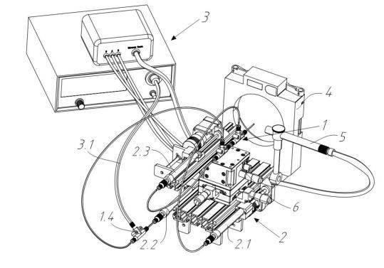 1、雙鞘液管路模塊;1.1、外鞘液不銹鋼管;1.2、內(nèi)鞘液石英毛細管;1.3、樣品石英毛細管;1.4、三通;1.41、第一T型三通;1.42、第二T型三通;1.5、外鞘液;1.6、內(nèi)鞘液;1.7、樣品液;1.8、液錐噴霧;2、集成化微流量泵控模塊;2.1、集成化微流量泵控模塊一;2.11、步進電機;2.12、絲桿;2.13、聯(lián)軸器;2.14、魯爾接頭玻璃注射器;2.15、圓接頭;2.2、集成化微流量泵控模塊二;2.3、集成化微流量泵控模塊三;3、高壓電勢加載模塊;3.1、高壓輸出導(dǎo)線;4、質(zhì)譜接口連接模塊;5、數(shù)碼顯微鏡組件;6、空間位置微調(diào)組件;6.1、三軸臺;6.2、M3螺絲;6.3、T型螺母。