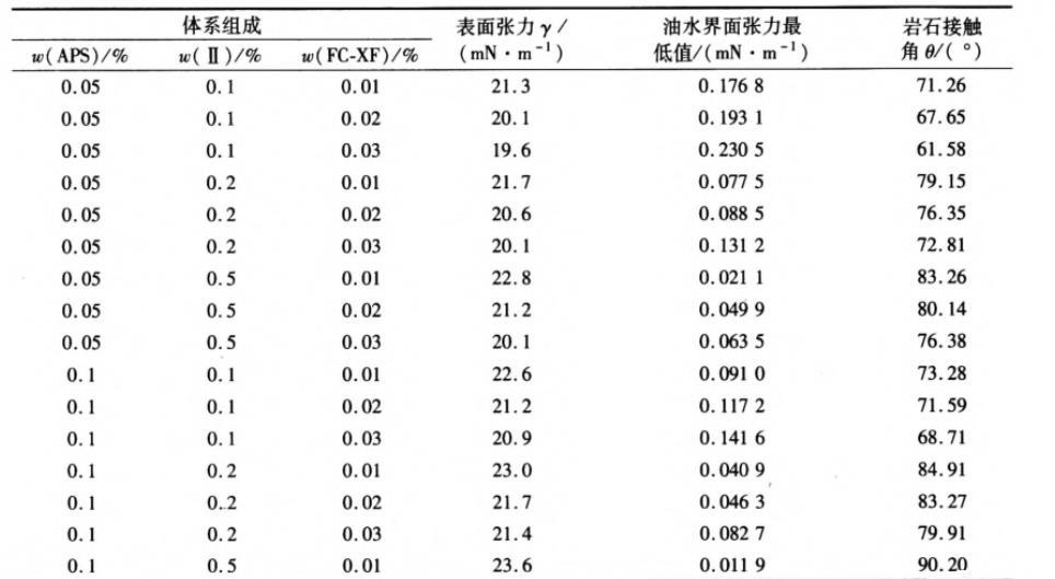 從圖4和圖5中也可以看出,當Ⅱ型潤濕劑質量分數為0.2%、APS質量分數在0.05%~0.20%之間、FC-XF質量分數在0.01%~0.03%之間時混合體系具有更高的界面活性。因此,選擇APS質量分數為0.05%、0.10%和0.20%,Ⅱ型潤濕劑質量分數為0.1%、0.2%和0.5%,FC-XF質量分數為0.01%、0.02%和0.03%進行三因素三水平的正交實驗,考察APS/Ⅱ/FC-XF混合體系的界面性能及與巖石的接觸角,結果如表1所示。