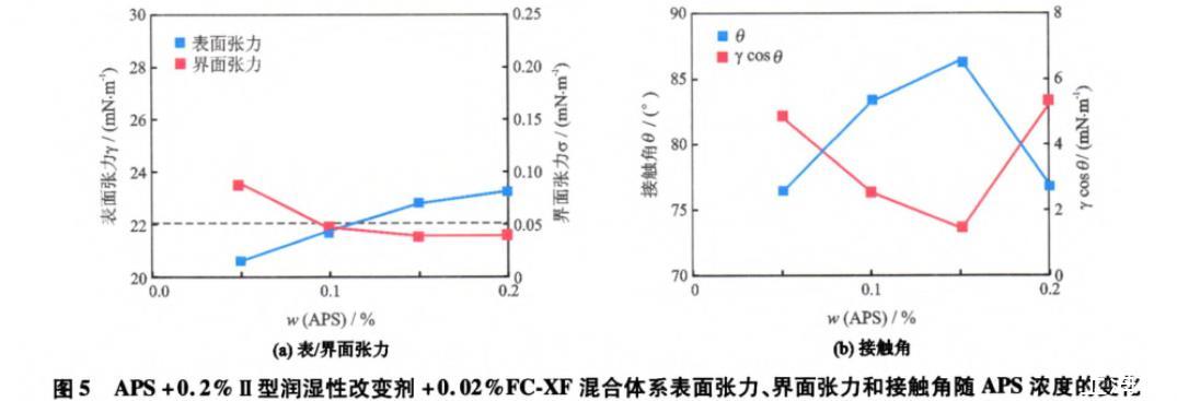 從圖5(a)中可以看出,隨著APS質量分數的增加,體系的表面張力增大,界面張力減小,這與FXCF對表/界面張力的影響機制相同。從圖5(b)中可以看出,隨著APS質量分數的增加,體系與巖石的接觸角先增加再減小,相應的γcosθ先減小再增大,均出現極值點,這與圖4(b)的變化趨勢不同。這是因為吸附Ⅱ型潤濕性改變劑和FC-XF使得巖石表面由水濕轉變為弱親水性潤濕(接觸角<75°),更易于吸附APS的親水頭基而使碳氫鏈在巖石表面暴露,這降低了巖石表面的親水性,因而隨著APS質量分數的增加接觸角增大。但是,當APS質量分數大于0.15%后,過多的APS分子可能在巖石表面發生雙分子層吸附或因競爭吸附而降低Ⅱ型潤濕性改變劑的吸附量,使得巖石表面的親水性增加。而且,接觸角的變化決定了γcosθ的變化趨勢,因而接觸角和γcosθ隨APS質量分數的變化曲線中均出現極值點。