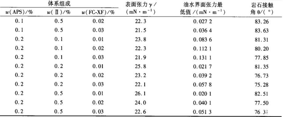 表1體系組成和含量對APS/Ⅱ/FC-XF混合體系界面性能的影響