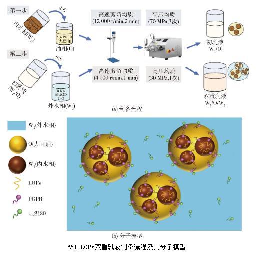 通過兩步法制備雙重乳液,制備流程及分子模型見圖1。操作步驟:將內、外水相及油相攪拌15 min,混勻后于4℃避光貯藏12 h備用;第一步,將質量分數為20%的LOPs水溶液作內水相,內水相與油相的質量比為4∶6。將內水相加入含有PGPR(質量分數為5%)的大豆油中,先經高速剪切機(12 000 r/min,2 min)混合后,再經高壓均質機在70 MPa條件下循環3次,獲得W1/O初乳液。第二步,將質量分數為0.8%的吐溫80水溶液作外水相,W1/O乳液與外水相的質量比為5∶5。將W1/O乳液加入外水相后,再用高速剪切機(4 000 r/min,1 min)混合,并經高壓均質機在30 MPa的條件下均質1次,獲得LOPs的W1/O/W2型雙重乳液,于4℃條件下存儲。