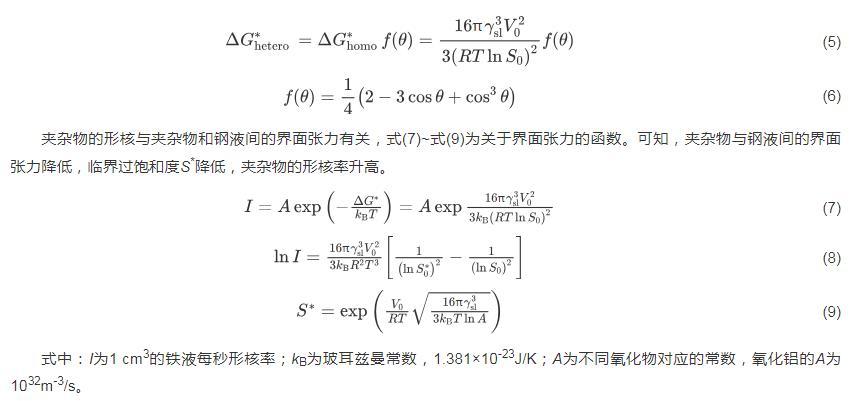 夾雜物與鋼液間的界面張力不僅會影響夾雜物的形核率,還會影響形核半徑的大小。以Al2O3為例,Al2O3的形核半徑和鋼液與Al2O3的界面張力的關系可以用式(10)來描述。