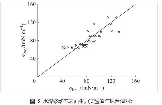 圖5水煤漿動(dòng)態(tài)表面張力實(shí)驗(yàn)值與擬合值對(duì)比