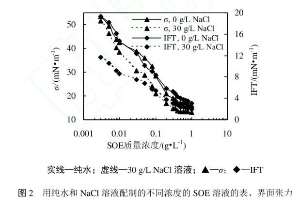圖2用純水和NaCl溶液配制的不同濃度的SOE溶液的表、界面張力