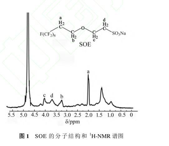 SOE的分子結構和1H-NMR(D2O,400 MHz)譜圖如圖1所示。圖中SOE分子中所有氫的化學位移δ(ppm)如下:δa=2.02和δb=3.25分別為—CH2CH2O—中氫的化學位移,δc=4.03和δd=3.68分別為與磺酸離子直接相連的—CH2CH2—中氫的化學位移。溶劑(D2O)中殘余氫的δ為4.79。1H-NMR的表征結果說明樣品為目標產物。