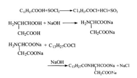 先合成十四酰氯和天冬氨酸鈉,然后再將十四酰氯與天冬氨酸鈉反應得到目標產物N-十四酰基天冬氨酸鈉。