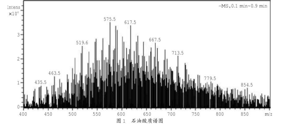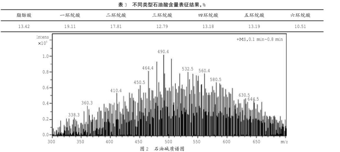 (1)萃出石油酸組分含量為3.88%,相對分子質主要分布在400~900,碳數對應C27~C62,結構以環(huán)烷酸為主;