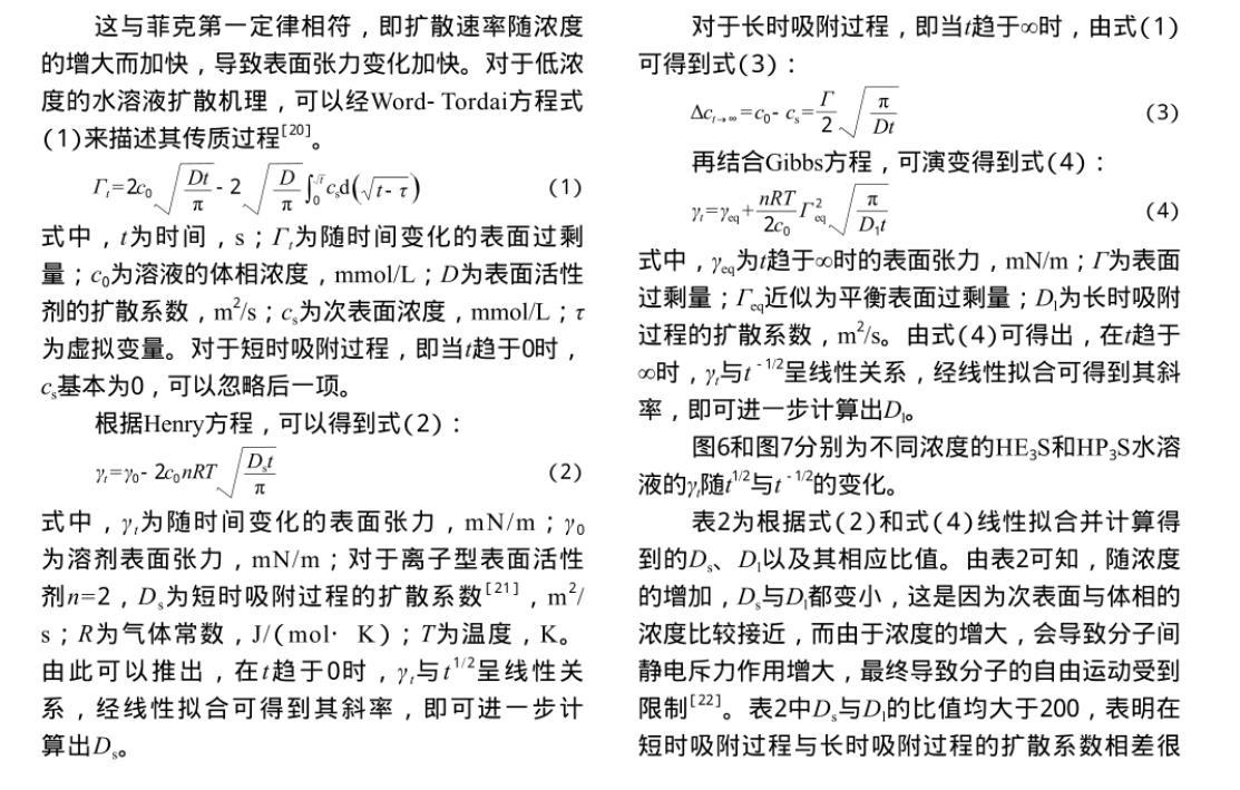 這與菲克第一定律相符,即擴(kuò)散速率隨濃度的增大而加快,導(dǎo)致表面張力變化加快。對(duì)于低濃度的水溶液擴(kuò)散機(jī)理,可以經(jīng)Word-Tordai方程式(1)來(lái)描述其傳質(zhì)過(guò)程。