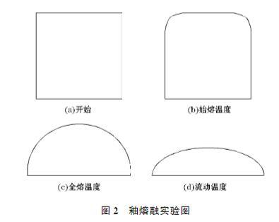 通過對釉料熔融實驗的觀察可以看到,隨著溫度升高,低共融物產(chǎn)生,試樣出現(xiàn)液相,逐漸變?yōu)槿垠w。四棱柱試樣最先變形的部位為頂部角點。由于角點是四棱柱曲率最大的部位(7/8的表面與空氣接觸),表面張力最大,表面能高,由表面張力產(chǎn)生的指向熔體內(nèi)部的附加壓力也最大,因此角點最先熔融變圓,此時試樣所處的溫度(1180℃),稱為釉的始熔溫度,釉層開始封閉,如圖2b所示。隨著溫度繼續(xù)升高,四棱柱的棱邊也開始熔融變圓,棱邊也是曲率較大的部位(3/4的表面與空氣接觸)。最后,四棱體的各個平面開始熔融變圓(1/2的表面與空氣接觸),整個試樣由于表面張力的作用變?yōu)榘肭驙睿藭r的溫度(1260℃)稱為全熔溫度,如圖2c所示,形成平整、光滑的釉面。釉層雖然處于黏性流動狀態(tài),但黏度較大不至于流淌,因此接近于釉的成熟溫度。溫度繼續(xù)升高,試樣流散開來,高度降至原有高度的1/3時的溫度(1300℃)稱為流動溫度,見圖2d。此時由于溫度升高,熔體表面張力減小,同時釉熔體黏度降低,受重力作用熔體會產(chǎn)生自然流淌,熔體表面由球面變?yōu)闄E球面。