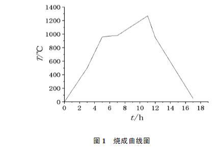 把磨好的釉料制成2cm×2cm×3cm正四棱柱試樣,置于窯門洞口內(nèi),借助于高溫顯微鏡可連續(xù)觀察其在加熱過程中的全部變化。本次實驗采用還原氣氛進行燒制,實驗最高燒成溫度為1270℃,氧化和還原氣氛轉(zhuǎn)換溫度為980℃,圖1為燒成曲線圖。