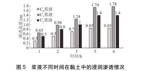 從圖5的試驗(yàn)結(jié)果可知:3種漿液在開始滲透后的3h內(nèi)浸潤滲透速度相對較快,3~5h之間,浸潤滲透速度相對變慢,5h后浸潤滲透高度趨于穩(wěn)定。在相同時(shí)間內(nèi),漿液在黏土中的浸潤滲透高度C1>C2>C0。滲透穩(wěn)定后,C1、C2漿液在黏土中的浸潤滲透高度比C0漿液的浸潤滲透高度分別提高了109.4%和64.7%,說明表面活性劑可以提高漿液的滲透性,且表面活性劑S1提高漿液滲透性的幅度更大。