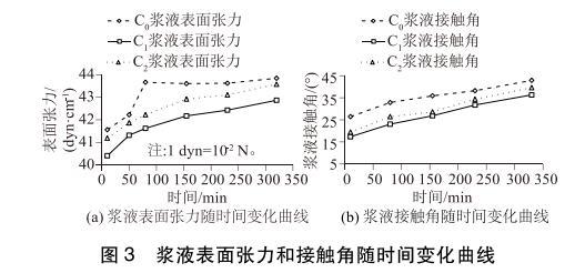 從圖3中可以發(fā)現(xiàn):3種漿液的表面張力和接觸角均隨時(shí)間的延長而變大;C1、C2的表面張力和接觸角在任何時(shí)刻均小于C0漿液的表面張力和接觸角。C1漿液的表面張力和接觸角比C2漿液的表面張力和接觸角更小。說明表面活性劑可以降低漿液的表面張力和接觸角,不同結(jié)構(gòu)的表面活性劑對漿液表面張力和接觸角的降低程度不同。