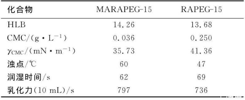按文獻(xiàn)方法測(cè)定MARAPEG-15和RAPEG-15的HLB值、濁點(diǎn)、乳化力、潤(rùn)濕力(采用國(guó)標(biāo)GB/T 11983-89)、吸濕性能、保濕性能、表面張力和臨界膠束濃度(最大泡壓法)。
