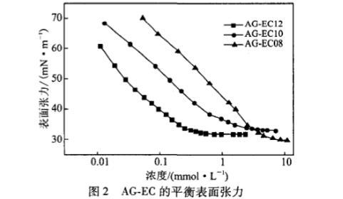 以去離子水為溶劑配制不同濃度的AG.EC溶液,靜置12 h后利用krussK12表面張力儀通過wilhelmy吊片法測定其平衡表面張力??刂迫芤簻囟?254-0.3)clC,測定前去離子水校準表面張力儀至(72±0.3)mN/m。由表面張力()一濃度對數(1gc)圖,可得AG.EC在水中的臨界膠束濃度(cmc)以及cmc下的表面張力(一)。