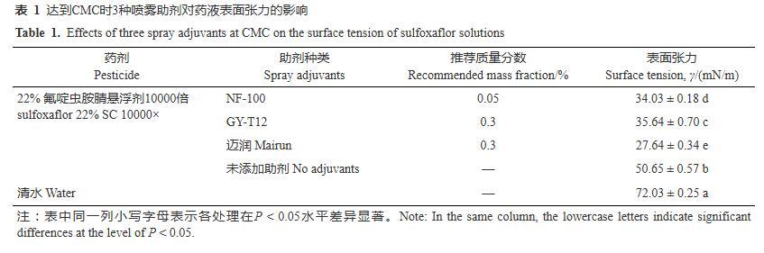 當(dāng)溶液中的表面活性物質(zhì)的質(zhì)量濃度達到其CMC時,液體具有良好的吸附和潤濕性,因此確定助劑的最低施用濃度以大于等于其CMC為依據(jù)。3種噴霧助劑的CMC測定結(jié)果見圖1。NF-100、GY-T12和邁潤3種噴霧助劑的CMC的對數(shù)值分別為2.40、3.43和3.46,得到其CMC分別為250、2708和2877 mg/L,其中糖基類表面活性劑NF-100具有更低的CMC,比另外兩種低一個數(shù)量級。根據(jù)助劑添加量應(yīng)適當(dāng)大于其CMC的原則,考慮量取方便,將NF-100的添加量確定為500 mg/L、折算為質(zhì)量分?jǐn)?shù)0.05%,將GY-T12和邁潤的添加量確定為3000 mg/L、折算為質(zhì)量分?jǐn)?shù)0.3%。在此添加量下,測定了3種噴霧助劑對氟啶蟲胺腈藥液表面張力的影響。結(jié)果(表1)表明,添加NF-100、GY-T12和邁潤3種助劑后,氟啶蟲胺腈藥液的表面張力顯著降低,由未添加助劑時的50.65 mN/m分別降低至34.03、35.64和27.64 mN/m,其中邁潤對藥液表面張力的降低效果最顯著,3種助劑之間均存在顯著差異(P<0.05)。