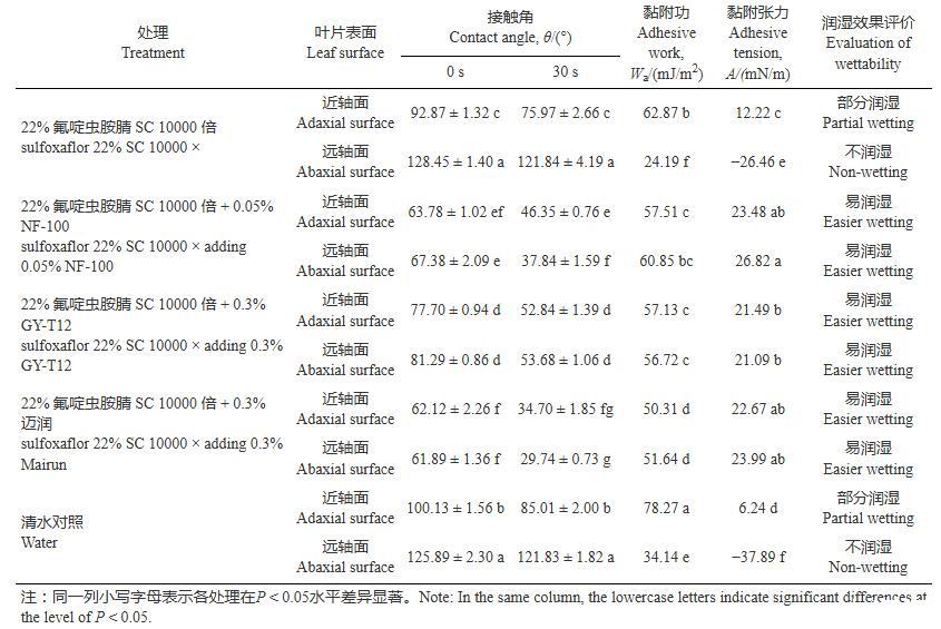 表2數(shù)據(jù)顯示,水滴在蘋果葉片近軸面和遠軸面上30 s時的穩(wěn)定接觸角分別為85.01°和121.83°,由此判斷蘋果葉片的近軸面為親水表面,遠軸面為疏水表面。未添加助劑時,22%氟啶蟲胺腈SC液滴在近軸面0~30s的接觸角動態(tài)變化為92.87°~75.97°,在遠軸面0~30 s的接觸角始終大于120°,說明22%氟啶蟲胺腈SC藥液對蘋果葉片近軸面可部分潤濕,對遠軸面無法潤濕。添加3種助劑后,藥液液滴在近軸面及遠軸面的接觸角均顯著降低至90°以下(P<0.05),此時可以同時潤濕兩種表面;其中在親水性近軸面0 s和30 s的接觸角分別降低15.2°~30.8°和23.2°~41.3°,在疏水性遠軸面分別降低47.2°~65.7°和68.0°~93.5°,說明添加助劑顯著降低了藥液的接觸角,且在遠軸面接觸角的降低幅度更大。