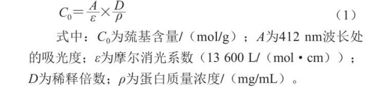 式中:C0為巰基含量/(mol/g);A為412 nm波長(zhǎng)處的吸光度;ε為摩爾消光系數(shù)(13 600 L/(molgcm));D為稀釋倍數(shù);ρ為蛋白質(zhì)量濃度/(mg/mL)。