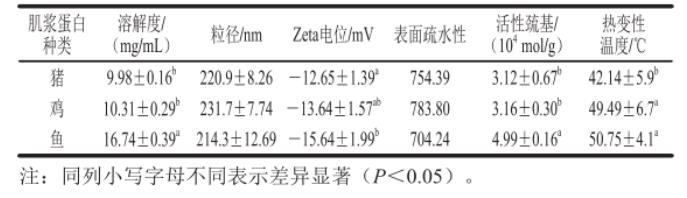 表面疏水性同時(shí)又與其他指標(biāo)有著密不可分的關(guān)系,例如熱變性溫度,因?yàn)檫m當(dāng)?shù)臒崽幚頃?huì)造成肌漿蛋白內(nèi)部疏水基團(tuán)暴露在蛋白質(zhì)表面,從而使蛋白質(zhì)的表面疏水性增強(qiáng),這樣就可以改善蛋白質(zhì)的乳化活性和乳化穩(wěn)定性。3種肌漿蛋白熱變性溫度都較低,在40~55℃之間,其中魚(yú)肉肌漿蛋白變性溫度最高而豬肉肌漿蛋白最低,且豬肉肌漿蛋白熱變性溫度與雞肉和魚(yú)肉間差異顯著(P<0.05),而雞肉與魚(yú)肉肌漿蛋白間的變性溫度無(wú)顯著性差異。所以在肌漿蛋白的研究中,如何根據(jù)不同蛋白的變性溫度差異,準(zhǔn)確控制熱處理的強(qiáng)度至關(guān)重要,本研究可給蛋白變性凝聚組裝類的研究提供基礎(chǔ)數(shù)據(jù)的參考。