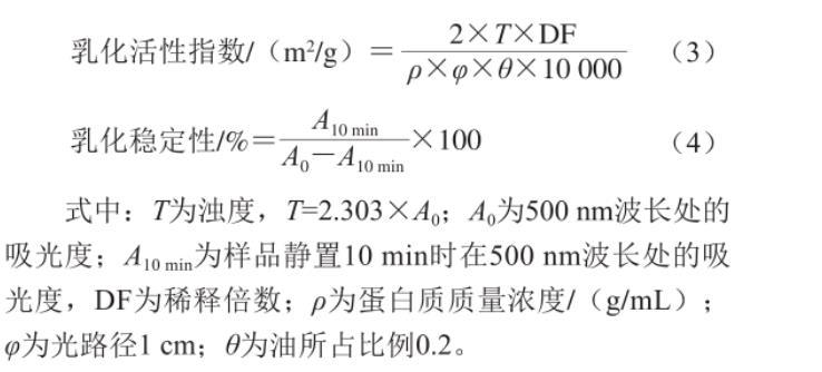 乳化穩(wěn)定性:將上述制得的乳液在4℃靜置10 min后,從底部取20μL乳化液重復(fù)上述操作,在500 nm波長(zhǎng)處測(cè)定吸光度。乳化活性指數(shù)和乳化穩(wěn)定性的計(jì)算公式如下: