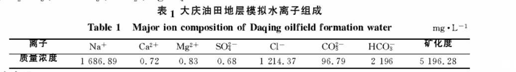 實驗用油樣為大慶原油與煤油按體積比9∶1混合而成(簡稱模擬油)。其中,大慶原油酸值為0.05 mg KOH/g;煤油由北京燕山石油化工有限公司提供,實驗前用活化后的硅膠反復(fù)吸附處理,處理后與二次蒸餾水界面張力大于48mN·m—1.實驗用Na2CO3弱堿溶液(簡稱Na2CO3溶液)由Na2CO3與蒸餾水配置,質(zhì)量分數(shù)為0.53%.實驗用水樣為大慶油田地層模擬水(簡稱模擬水),離子組成見表1.實驗所用試劑NaCl、Na2CO3、NaHCO3、CaCl2、MgSO4均為分析純。