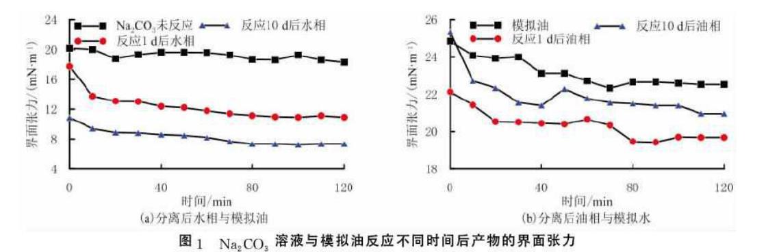 在Na2CO3溶液與模擬油反應(yīng)1d和10d后,分離得到的水相及油相分別與模擬油及模擬水間的界面張力隨測定時間關(guān)系見圖1.由圖1(a)可以看出,Na2CO3溶液和模擬油反應(yīng)1d及10d后分離出的水相與模擬油的界面張力,比未反應(yīng)Na2CO3溶液與模擬油的界面張力低,且隨著反應(yīng)時間增加,水相與模擬油的界面張力降低。這說明模擬油中酸性物質(zhì)與Na2CO3溶液反應(yīng)生成的部分界面活性物質(zhì)具有較好的水溶性。水溶性的界面活性物質(zhì)在油水界面處吸附,使分離出的水相與模擬油界面張力降低;隨著反應(yīng)時間的增加,所生成的界面活性物質(zhì)增多,分離出的水相與模擬油的界面張力降低幅度增大。