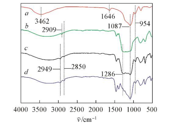 圖2為SiO?顆粒改性前后的紅外光譜圖。在裸露的SiO?顆粒(圖2譜線a)上,3459 cm?1處出現(xiàn)羥基的氫氧鍵伸縮振動(dòng)吸收峰,1646 cm?1處是納米SiO?表面吸附水的氫氧鍵振動(dòng)吸收峰,而在改性的顆粒上這2處吸收峰強(qiáng)度有所降低甚至消失,這是由于SiO?顆粒表面的硅羥基(Si—OH)與硅烷偶聯(lián)劑發(fā)生縮合反應(yīng)而數(shù)量減少,并且改變了顆粒表面與水之間氫鍵的鍵合密度;在圖2譜線b~d中,2949處和2850 cm?1處的吸收峰可分別歸屬為甲基和亞甲基上的碳?xì)滏I伸縮振動(dòng);并且這些吸收峰強(qiáng)度增加,說明甲基和亞甲基數(shù)量增加。在1170~1286 cm?1間的峰為—CF?、—CF?的伸縮振動(dòng)峰,由于—CF?、—CF?的伸縮振動(dòng)峰與1087~1200 cm?1間的硅氧鍵伸縮振動(dòng)吸收峰重合,從而導(dǎo)致圖2譜線b~d中1087~1286 cm?1間的吸收峰變寬,并且吸收峰強(qiáng)度依次減弱,說明—CF?、—CF?數(shù)量減少。綜上所述,可初步說明納米SiO?表面被不同比例的碳?xì)滏満头兼湼采w。