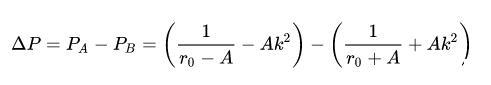 我們可以看到,在不同的地方,柱面的曲率都發(fā)生了變化,這種變化和表面張力一起,就導(dǎo)致了水柱當(dāng)中不同地方內(nèi)部壓力的變化。那么,我們?nèi)绾闻袛噙@種影響呢?我們說(shuō),如果A點(diǎn)(柱半徑縮小的地方)的壓力上升,B點(diǎn)壓力下降,那么: