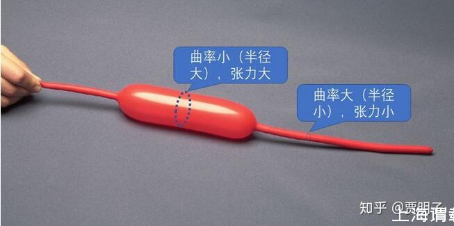 氣球內(nèi)部的氣體壓力處處相等,但是,接觸過(guò)這種氣球的人都有一個(gè)經(jīng)驗(yàn),就是粗的地方繃得緊,而細(xì)的地方繃得就不那么緊。如上圖所示,繃得緊的地方和繃得松的地方,產(chǎn)生的壓力差是相等的,但是他們的曲率是不相等的:曲率越大,同樣的張力所能產(chǎn)生的壓力差就更大。