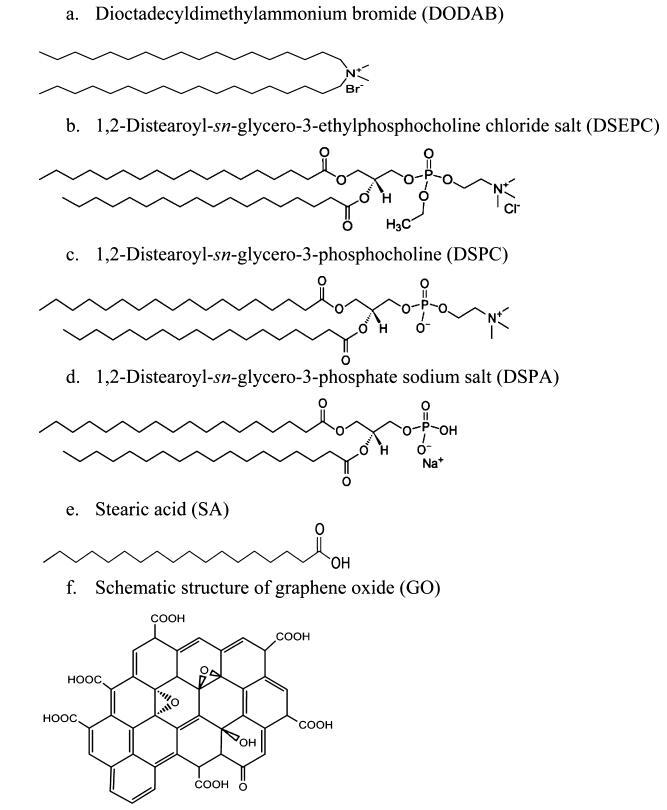 在這項研究中,為了理解和定義性質 GO和脂質模型之間相互作用的方向和方向 具有不同頭部基團的朗繆爾單層技術 應用于空氣-水/水界面以表征 分子堆積、吸附和偶極子等性質 片刻。 具有相同烷基鏈長度的五種脂質(18 碳)但不同的電荷和頭基是 選擇合理化可能的相互作用。 所有烷基 本研究中使用的脂質有 18- 碳鏈消除終端可能的影響 烷基,如方案 1 所示。 Langmuir-Blodgett 薄膜 轉移到基板上以進一步表征 使用原子力顯微鏡的單層形態 (原子力顯微鏡)。