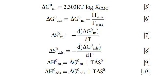 計算了在不同濃度和溫度下[C10-4-C10im]Br2在不存在和存在BSA的情況下的膠束化和吸附熱力學參數,以確定溫度和BSA濃度的升高是否有利于膠束化(本體相濃度)或吸附 [C10-4-C10im]Br2的(界面濃度)。使用以下關系式計算各種熱力學參數。[79]
