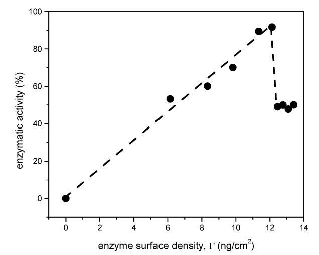在5到18 mN/m的表面壓力下,DMPA的表面密度從1.45×1017分子/m2變化到2.30×1017分子/m2。 考慮到DMPA和DSAP都保留在界面上,單層的壓縮應減少磷脂和蛋白質的可用面積。 因此,可以估計酶的表面密度,并將其與酶活性關聯起來(圖2)。 高達12.1 ng/cm2(對應于18 mN/m的表面壓力)時,觀察到線性相關性,表明活性的增加直接反映了酶表面密度的增加。 然而,當蛋白質表面密度高于12.1 ng/cm2時,酶活性會突然下降。
