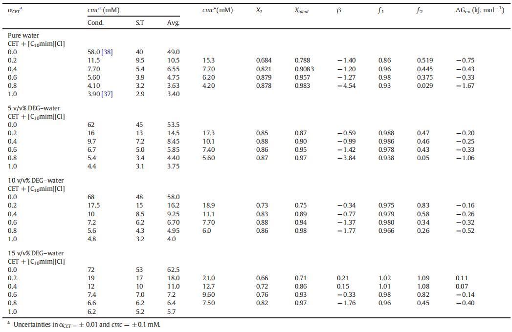 表3:在T=298.15 K時,CET+[C10min][Cl]混合物在純水以及不同體積百分比的二甘醇-水二元混合物中的膠束化標準吉布斯自由能(ΔGm0)值。