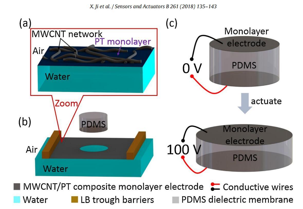 圖1。使用Langmuir-Schaefer轉移單層電極制作低壓DEA(a)在空氣-水界面形成的單層復合電極:嵌入聚(烷基噻吩)(PT)單層內的互連MWCNT網(wǎng)絡。(b)Langmuir-Schaefer(LS)將復合單分子膜從空氣-水界面轉移到PDMS介電膜上,制成DEA的一個電極。(c)DEA由一層1.4μm厚的硅酮膜組成,硅酮膜夾在兩個亞100 nm厚的復合單層電極之間。