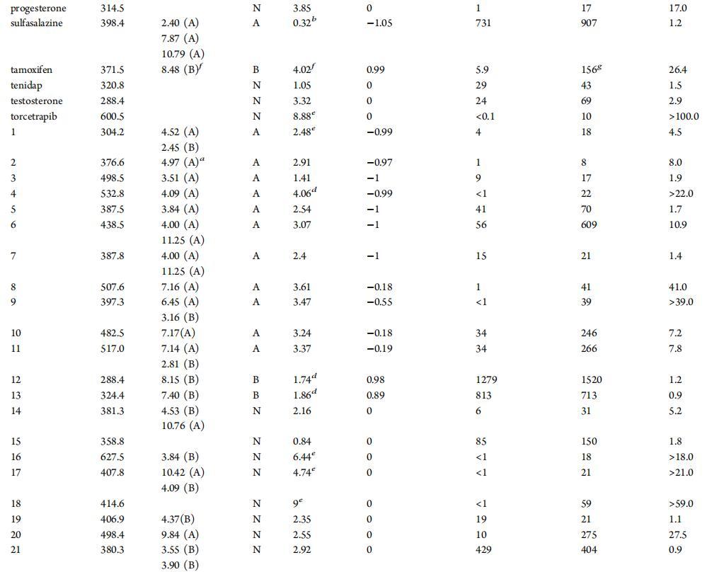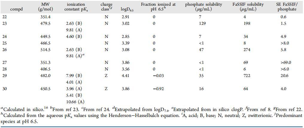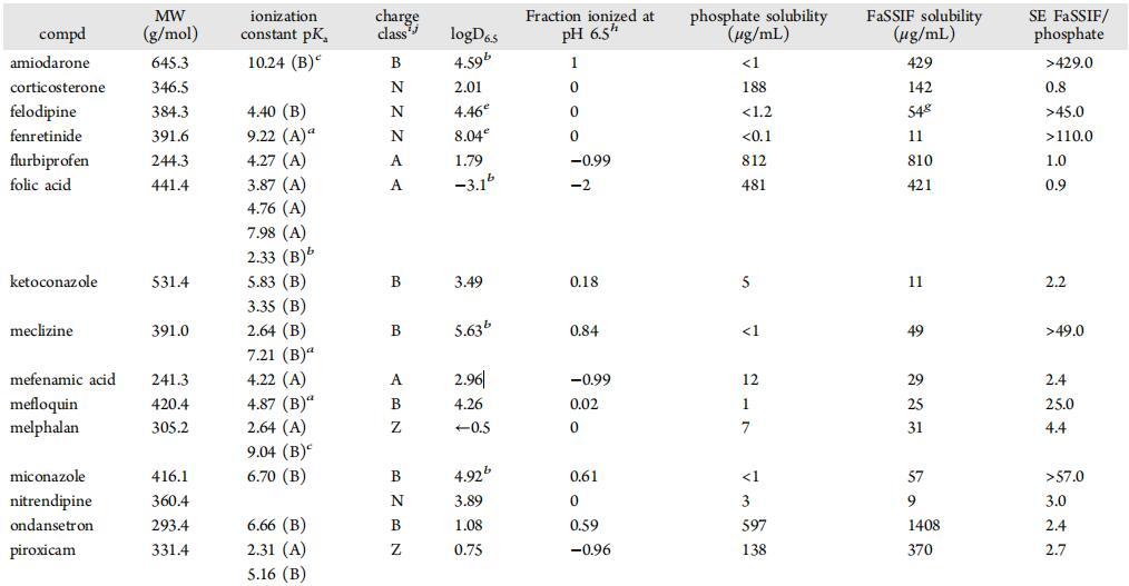 在FaSSIF和水性緩沖液中的溶解度評估和物理化學特性。選擇了一組21種上市藥物和30種來自不同研究項目的羅氏化合物,因為它們在pH值為6.5的水性緩沖液和FaSSIF介質中的溶解度不同。作為標準做法,所有溶解度和表面壓力剖面測量均在室溫下進行,而不是在37°C下進行。盡管溫度可能會影響藥物溶解度、脂質聚集體分配和溶解,據報道,牛磺膽酸膠束的聚集數對溫度變化相對不敏感。19該化合物組包含不同的化學性質、廣泛的親脂性,并涵蓋不同類型和程度的電荷狀態(tài),包括中性、酸性、堿性和兩性離子分子。表1列出了主要理化性質和溶解度數據。