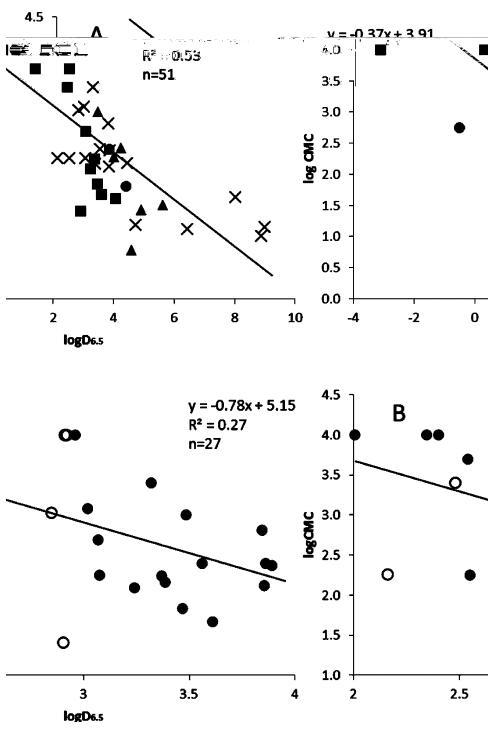 圖6。對于分類為酸的完整化合物組(A),根據pH 6.5(logD6.5)下的辛醇分配系數繪制對數CMC(μM)(■),基地(▲),中性離子(x)和兩性離子(?),以及l(fā)ogd2和logd4(B)范圍內的化合物。圖B中的開放圓對應于從文獻檢索、預測或從pH值為7.4的logD推斷的logD值。高于或低于檢測限的值在檢測限處繪制。