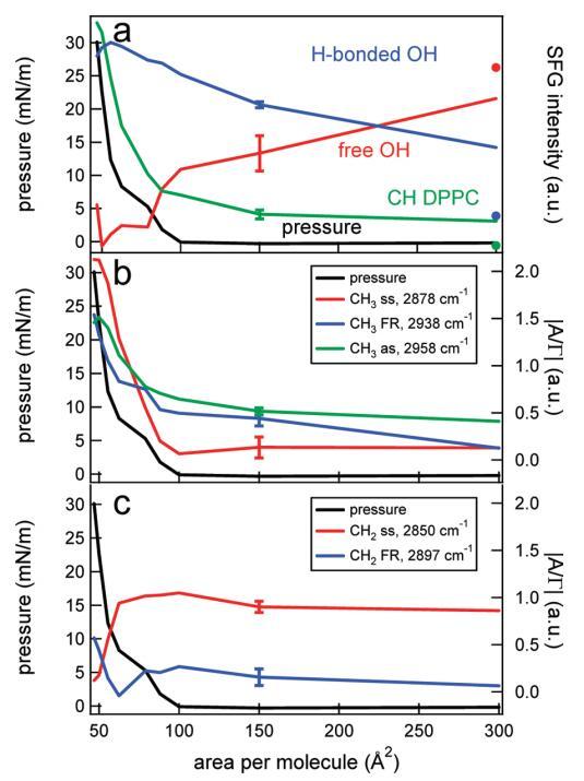 圖6。(a)DPPC的CH信號(hào)(綠色)、Hbonded OH信號(hào)(藍(lán)色)和游離OH信號(hào)(紅色)的表面壓力(黑色,左軸)和積分SFG強(qiáng)度(右軸)作為每個(gè)分子面積的函數(shù)。數(shù)據(jù)點(diǎn)是通過(guò)整合特定光譜區(qū)域獲得的,該區(qū)域由圖5的光譜中的彩色方塊標(biāo)記。純水層的CH、OH和游離OH面積(在表面活性劑攤鋪前測(cè)量)分別表示為綠色、藍(lán)色和紅色圓點(diǎn)。為清晰起見(jiàn),集成SFG信號(hào)已被標(biāo)準(zhǔn)化,并且彼此略微偏移。(b)表面壓力(黑色,左軸)和不同CH3共振(右軸)的絕對(duì)振幅/帶寬比(|A/Γ|),通過(guò)使用洛倫茲線型模型擬合圖5中的數(shù)據(jù)獲得。(c)和b一樣,但是對(duì)于CH2共振。典型誤差條如圖所示。