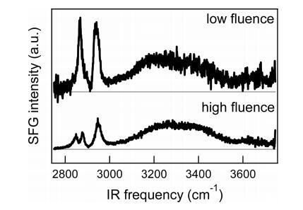 圖7。高密度水上DPPC的SFG光譜(SSP極化)(~每分子45?2)在低濃度下(~1.5 mJ/cm2)和高通量(~10 mJ/cm2),單脈沖加熱量分別在0.3至3°C(取決于紅外頻率)和2至19°C之間。為了清晰起見(jiàn),對(duì)光譜進(jìn)行了偏移,并根據(jù)相對(duì)紅外強(qiáng)度進(jìn)行了縮放。注意,由于在高通量下發(fā)生的熱效應(yīng),形狀非常不同。這兩種光譜都是用非旋轉(zhuǎn)槽測(cè)量的。