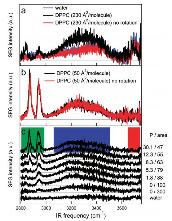 圖5。(a)DPPC在水上以230?2/分子(黑色)和不旋轉(zhuǎn)(紅色)槽的SSP極化的SFG光譜。樣品以這樣的方式旋轉(zhuǎn):在激光焦點(diǎn)處,樣品以~0.06 m/s。不旋轉(zhuǎn)時(shí),光譜與水相同?空中接口(藍(lán)色)。(b)在高密度(每個(gè)分子50?2)下,旋轉(zhuǎn)(黑色)和非旋轉(zhuǎn)(紅色)之間沒(méi)有區(qū)別。(c)裸露水面的SFG光譜(SSP極化)(底部光譜)和密度增加的水中DPPC的SFG光譜。壓力(mN/m)和每個(gè)分子的面積(?2)分別從底部到頂部增加和減少,在圖表旁邊給出。每個(gè)分子的面積由氯仿溶液滴的數(shù)量控制。彩色方塊標(biāo)記了圖6中使用的積分區(qū)域。本實(shí)驗(yàn)中使用了相對(duì)較低的紅外注量(1.5 mJ/cm2)。
