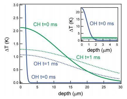 圖9。對(duì)于與CH(綠色)或OH(藍(lán)色)振動(dòng)共振的紅外光束,溫度隨著進(jìn)入水層的深度而升高。實(shí)線和虛線分別表示t=0和t=1 ms。插圖顯示了相同的圖形,但帶有擴(kuò)展的yaxis。