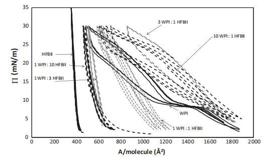 值得注意的是,對于純HFBII,П–A等溫線在連續(xù)的壓縮膨脹循環(huán)中不會發(fā)生變化,這再次表明HFBII不可撤銷地附著在界面上,幾乎沒有任何構(gòu)象變化。對于純WPI和1:1混合物,П–A等溫線略微向較小區(qū)域移動,這表明由于WPI分子的構(gòu)象變化、多層形成或如前所述,由于WPI的解吸,表面重排的可能性較小。