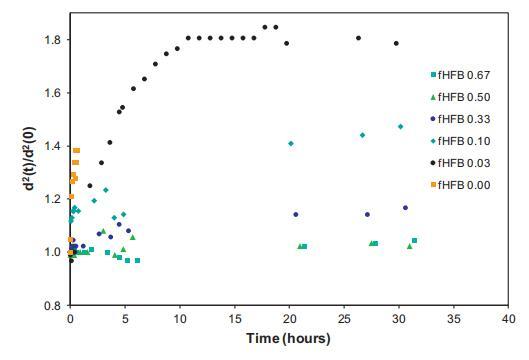 氣泡尺寸隨時間的相對增加如圖9所示,表示為d2(t)/d2(0)。考慮到環(huán)境充氣樣品的泡沫穩(wěn)定性,對于純HFBII系統(tǒng),在本實驗期間未發(fā)現(xiàn)平均氣泡尺寸的顯著變化,表明幾乎不可能發(fā)生任何歧化。在純WPI的情況下,可以發(fā)現(xiàn)氣泡尺寸急劇增加,表明對歧化的穩(wěn)定性較差。在混合情況下,隨著fHFBII的增加,我們可以看到氣泡尺寸穩(wěn)定性增加的趨勢。我們可以粗略地說,當(dāng)fHFBII<0.2時,氣泡大小的初始演化在很大程度上取決于WPI。然而,當(dāng)fHFBII>0.2時,HFBII的存在控制泡沫穩(wěn)定性。這與在朗繆爾槽中觀察到的初始?xì)馀荽笮『臀綄拥内厔莘浅R恢隆?