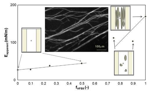 圖2。表觀模量作為擴(kuò)散層HFBII分?jǐn)?shù)的函數(shù),以及槽屏障之間界面上褶皺斑塊的圖示。右邊是純HFBII層的一個褶皺斑的顯微鏡照片。