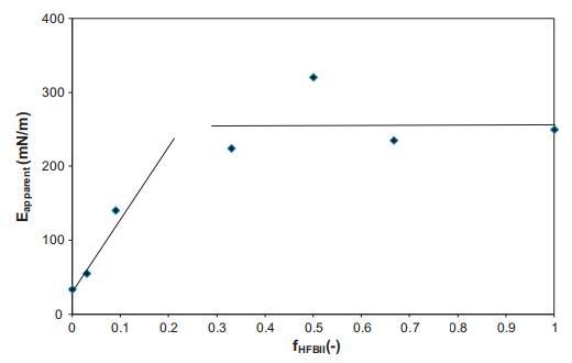 為了便于比較,從圖1的數(shù)據(jù)中,使用表面壓力第一次上升的斜率(由第一次壓縮產(chǎn)生)和公式E=(?2)提取了表觀膨脹模量(E)??1)/ln(A1/A2)。曲線的斜率總是在表面壓力在15到25 mN/m之間波動的表面積范圍內(nèi)確定的。圖2顯示了表觀模量作為混合比的函數(shù),表示為HFBII分?jǐn)?shù)fHFBII=cHFBII/(cHFBII+cWPI)。